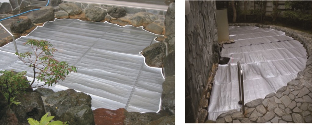 《上記表について》浴槽の温度変化データーは、地域、気候、運用停止時間で異なります。表の事例では、42℃のお湯を夜間4.0℃の外気温度環境下で、6時間放置した場合、敷設なしの場合では、6時間後には13℃まで低下します。敷設ありでは、29℃までの低下温度を維持。敷設効果は、比較しますと約16℃の差がでます。一般設備では、その後低下した分を濾過循環式で再加熱で運転されます。通常 5.0㎥ の露天浴槽では、年間のLPGガス料金代が、敷設方式ですと約200.000円の節約となります。特に風の強い地域、季節では、より温度低下があり燃料費が増します。