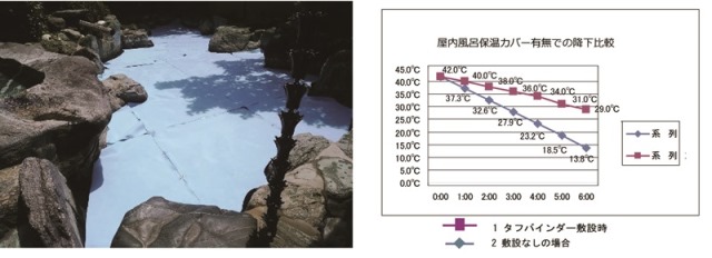 タフ バインダーマットは、夜間の湯の温度の放熱防止、省エネ対策から、雑菌、枯葉などの進入、レジオネラ属菌の生息を防ぐ対策、防塵面でもご評価をいただいています。又、現場の日常作業面の軽減策、湯槽に入ることなく1人でも敷設、収納が可能です。屋内浴場の天井面の結露、カビの蔓延防止対策にも効果がすぐ表れます。又旅館、ホテル等の露天風呂施設でも、高い省エネの効果を実感していただいています。衛生環境等の改善対策にお役立て下さい。